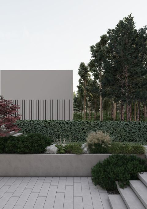 Projektas, besiribojantis su mišku ir glaudžiai prisišliejusiais kaimynais. Pagrindiniai uždaviniai čia buvo funkcionaliai suplanuoti parkavimo zoną, išlaikant vietą augalams, sukurti jaukesnį galinį kiemą ir jį pridengti nuo kaimynų akių. Svarbu buvo neatitrūkti nuo miško konteksto, bet kartu išlaikyti modernios architektūros užduotą toną.